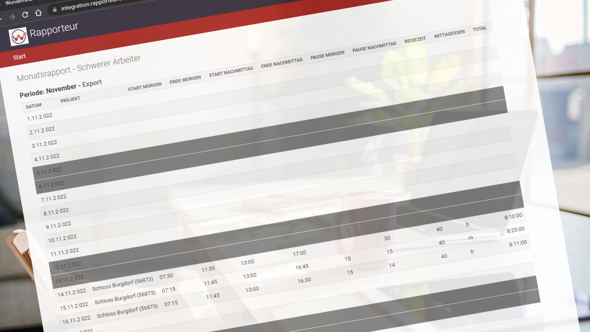 Bestimmt hast du bereits ein Rechnungssystem. Um mit den Zahlen weiterzuarbeiten kannst du bequem eine Liste mit Aufwänden und Materialien als Excel Datei exportieren. Damit kannst du deine eigenen statistischen Berechnungen machen oder die Daten als Anhang für eine Rechnung weiterverwenden.