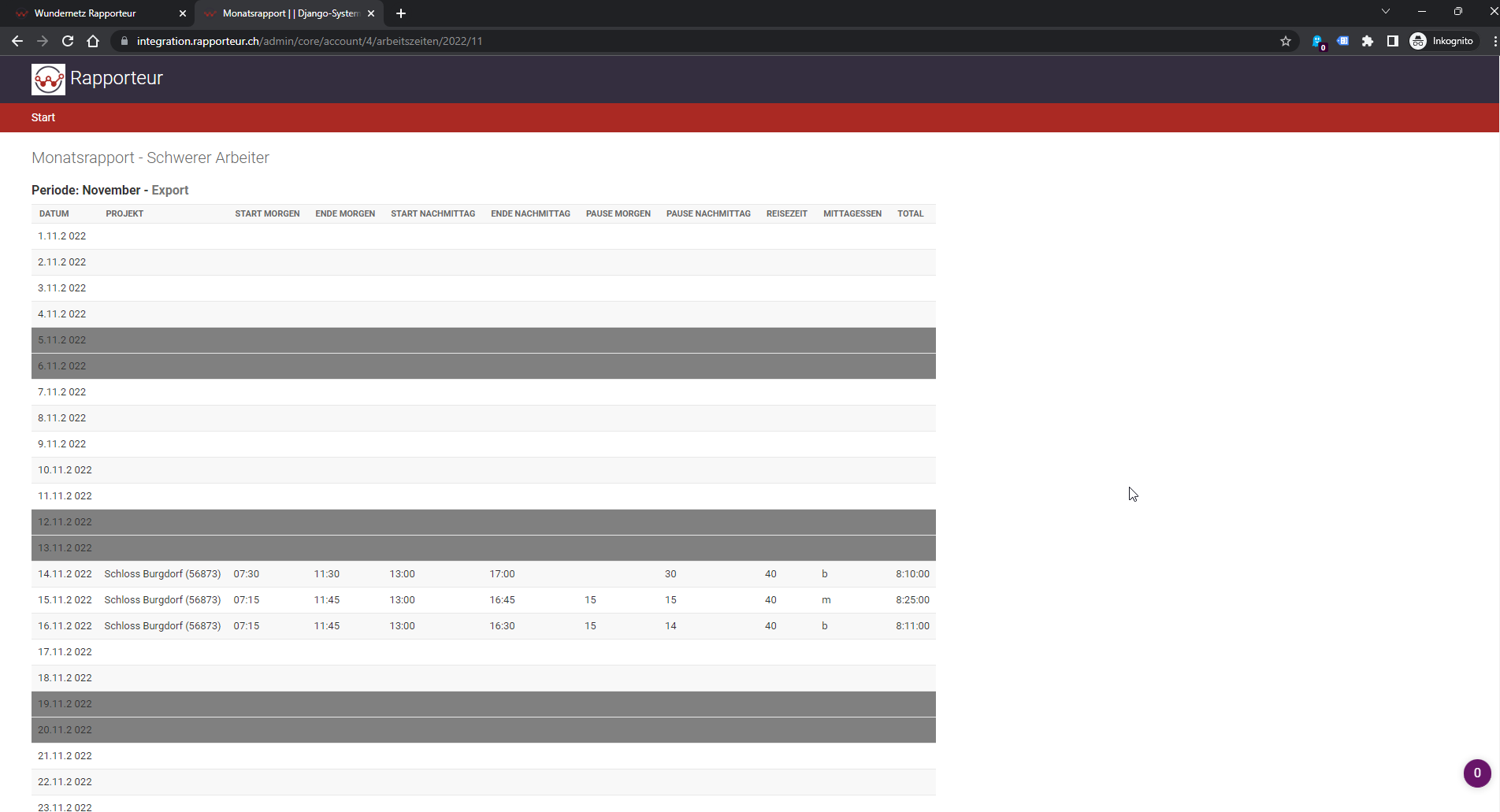 Im Monatsrapport sind die Arbeitsstunden deiner Mitarbeiter sichtbar. Diese Zahlen kannst du gleich für deine Lohnbuchhaltung weiterverwenden. Auch hier ist ein Export als Excel möglich.
