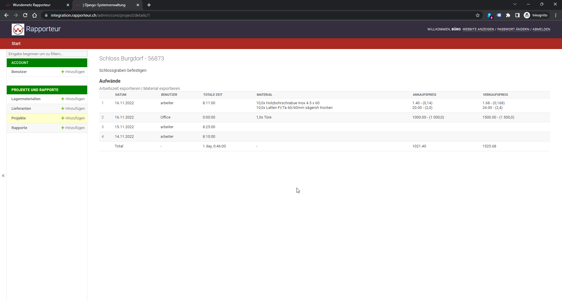 In der Projektansicht stehen dir alle Arbeitseinsätze per Klick zur Verfügung. Dazu hast du auch eine Übersicht über das bereits verbaute Material. So weisst du genau, wenn ein Projekt aus dem Ruder läuft.