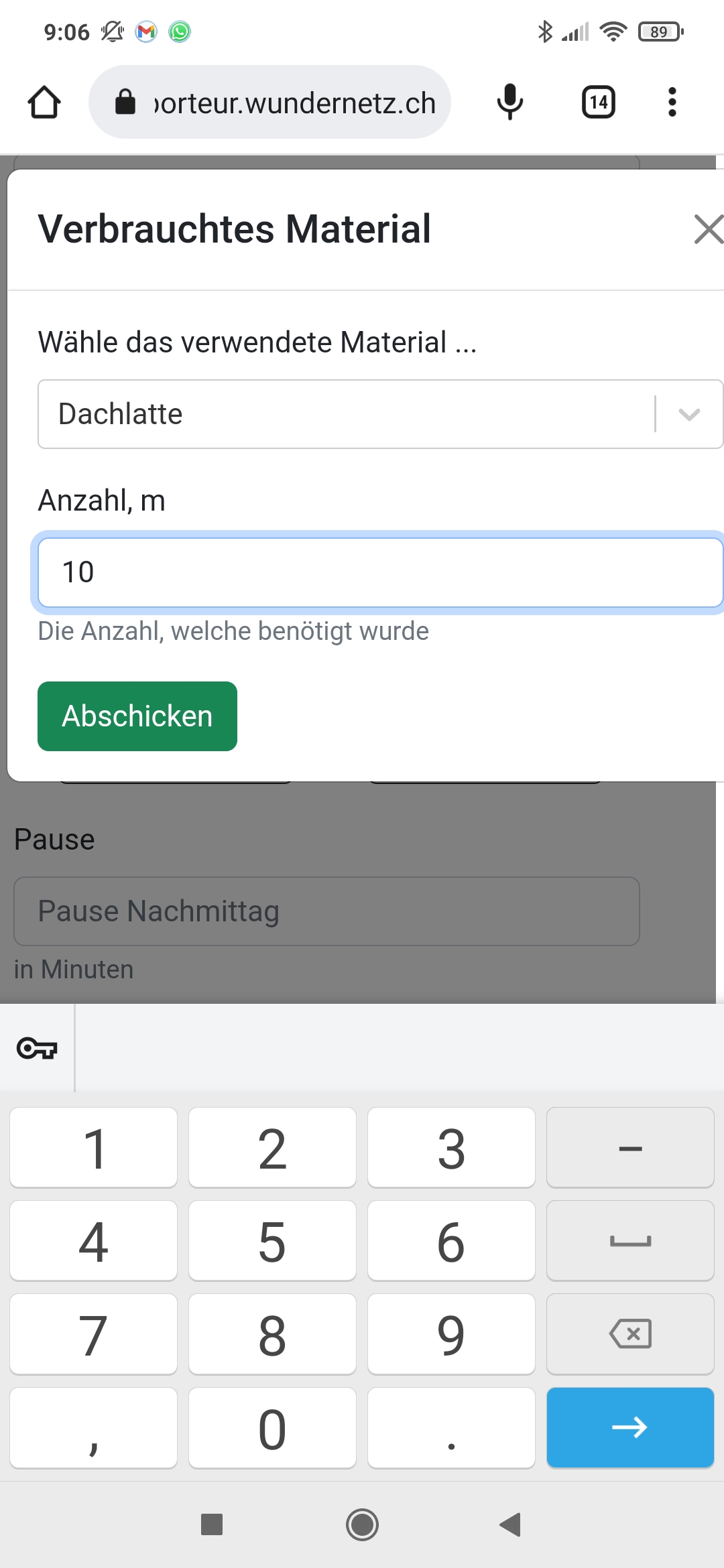 Verbautes Material aus dem Katalog auswählen und erfassen.